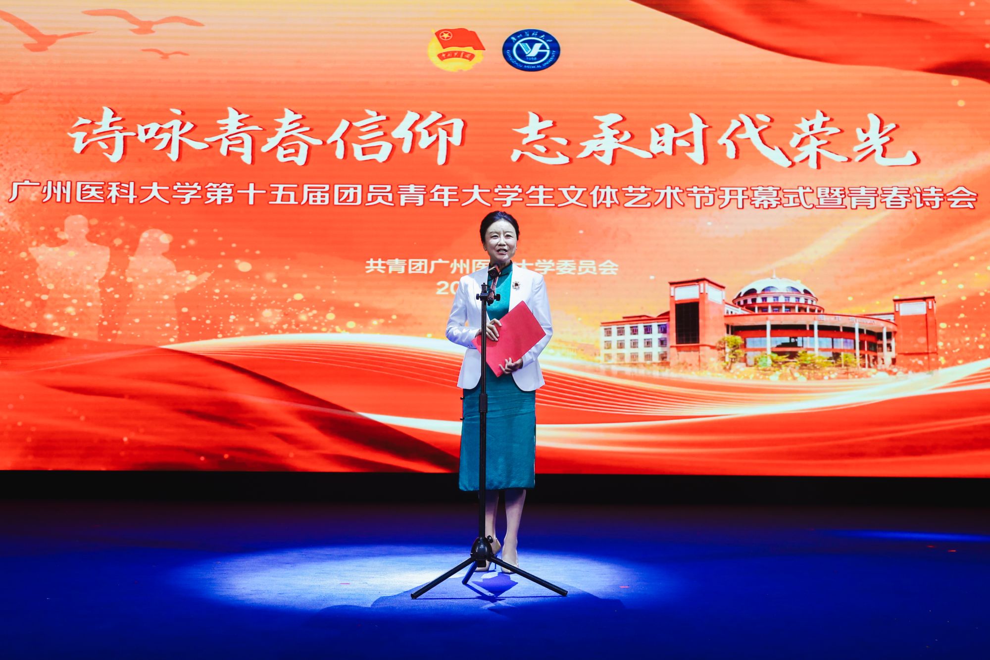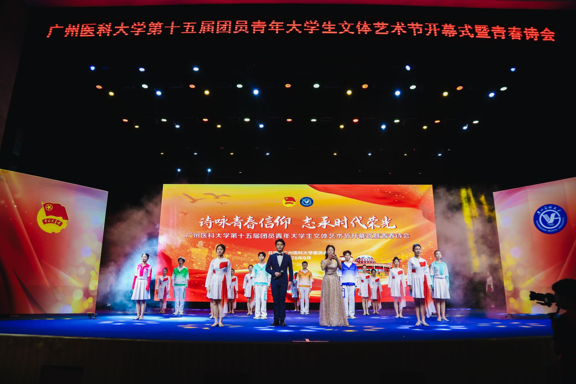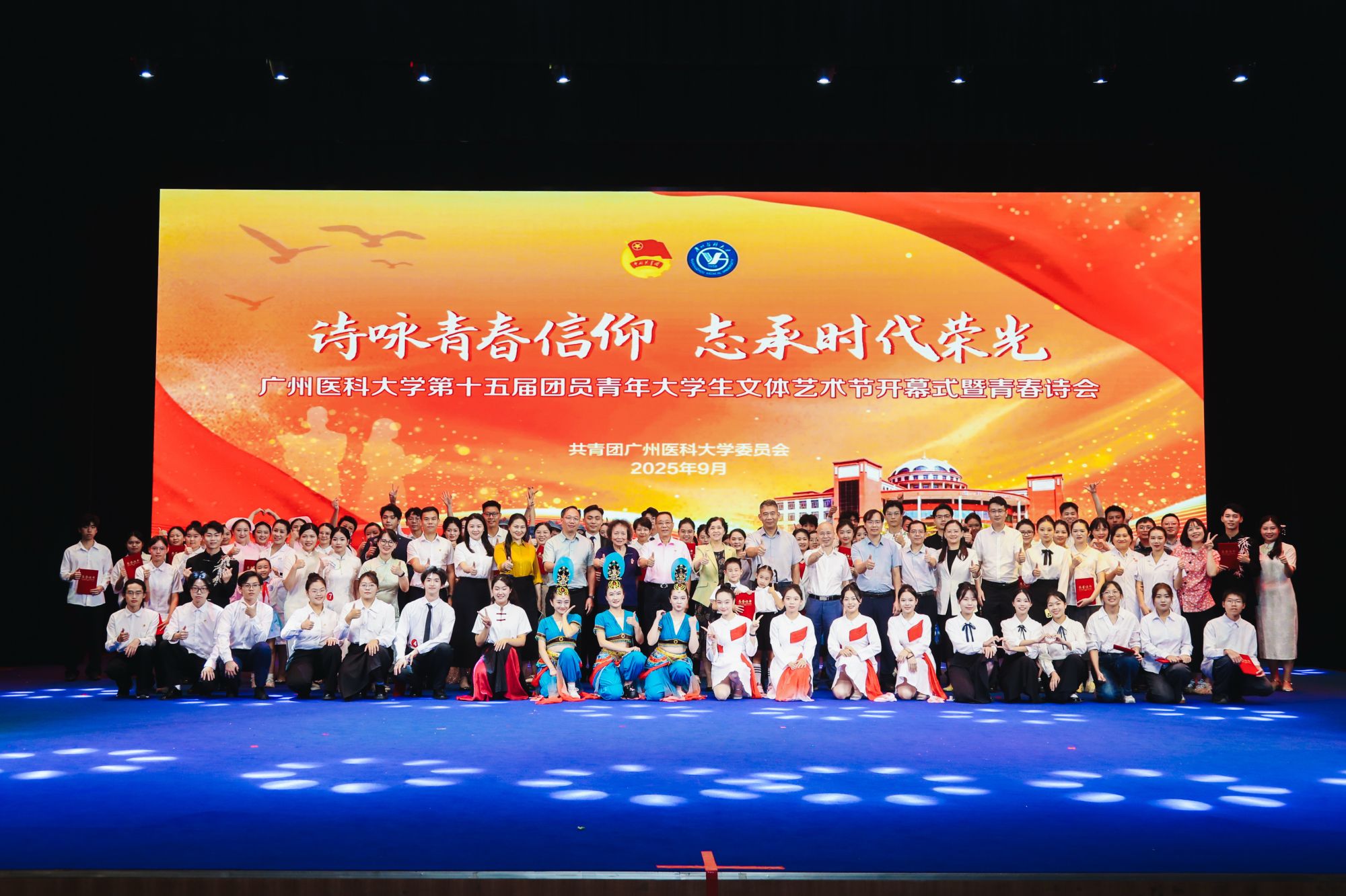 9月28日,由共青团广州医科大学委员会主办,校学生会、学生艺术团承办的第十五届团员青年大学生文体艺术节开幕式暨青春诗会于番禺校区礼堂举行。学校党委书记曾颖如、副校长周麟,关工委陈金城同志、李静娴同志,党委办公室、党委宣传部、党委学生工作部、教务处、离退休人员管理处、学校工会、学校团委负责人,各直属团组织负责人、全体团干参加活动。活动同时吸引了超过1000人次的团员青年现场参与。