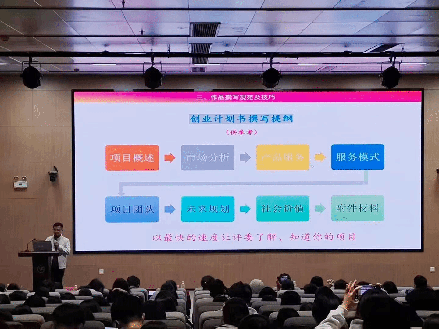 在“挑战杯”竞赛专题培训环节,学校团委副科长钱丹老师详细介绍第十五届“挑战杯”创业计划竞赛的赛事章程、最新变化、赛程安排以及项目计划书撰写注意事项,围绕作品申报要求、评审核心要点、作品撰写规范、参赛准备与建议等展开细致解读。他从“挑战杯”创业计划竞赛备赛逻辑切入,从市场需求、服务模式、社会价值、盈利模式、团队搭建等维度介绍项目计划书撰写规范及技巧。