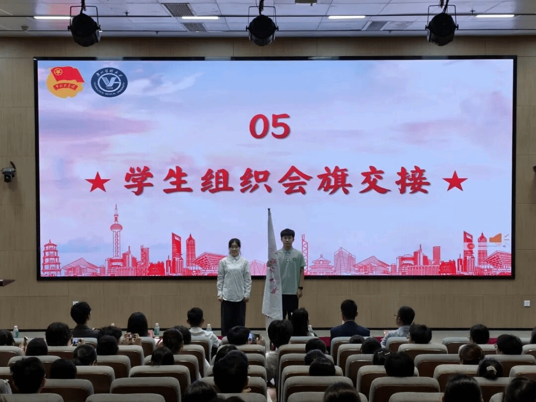 学校学生会、学生社团联合会、学生媒体工作联合会、学生艺术团、学生科技协会、学生勤工兼职协会、学校青年志愿者协会、学校红十字会学生理事会等校级学生组织代表依次上台进行会旗交接仪式。
