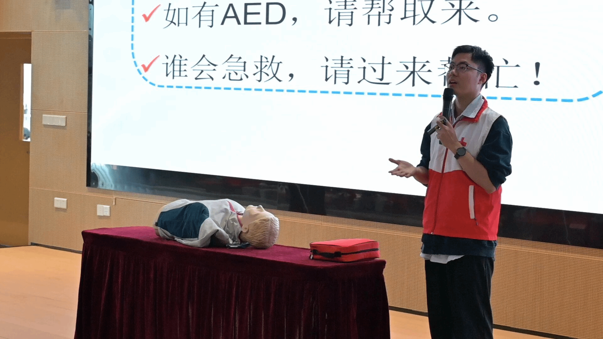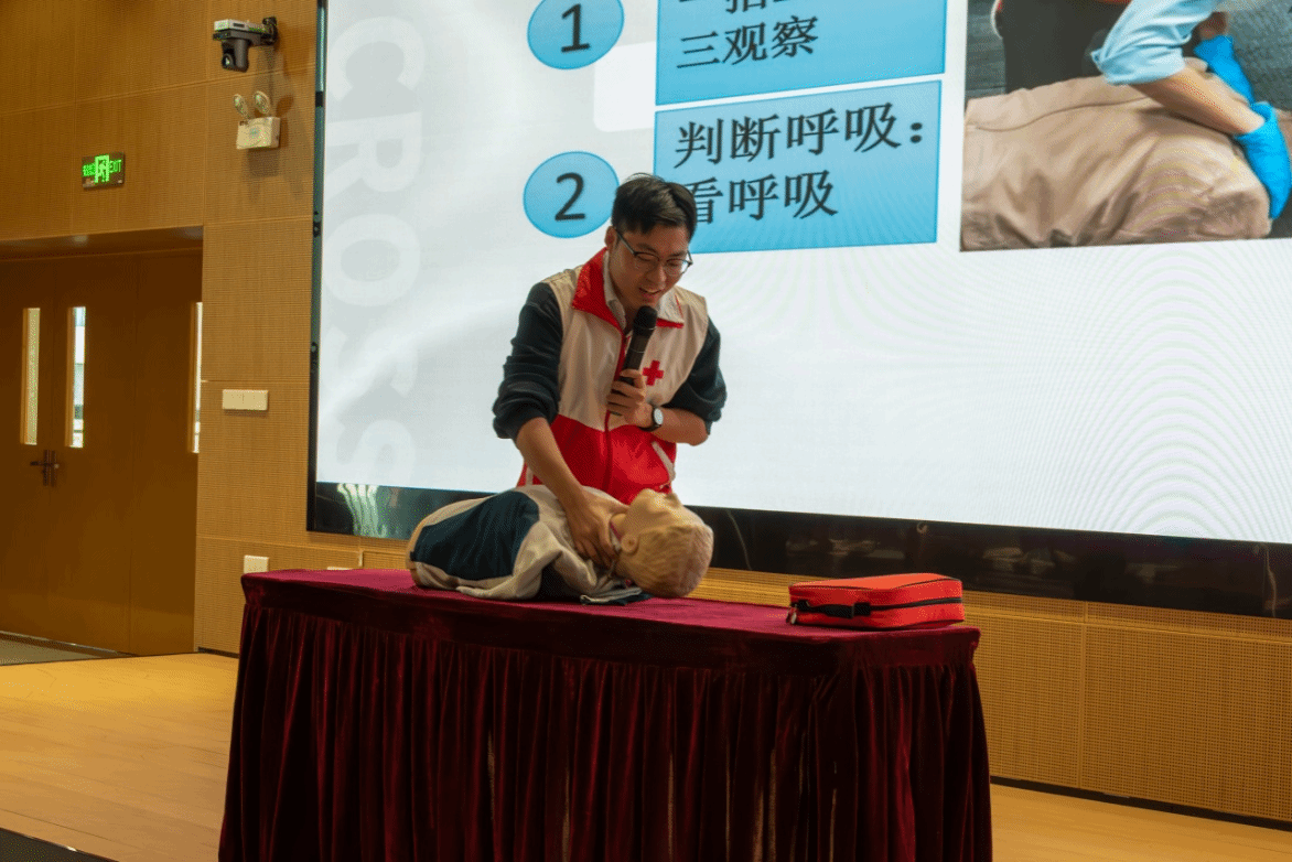 广东省红十字会应急救护培训师曾德儒老师开展了心肺复苏(CPR)与自动体外除颤器(AED)实操教学。他条理清晰地拆解心肺复苏全流程,从意识、呼吸的快速判断方法,到胸外按压的深度、频率、手法等核心技巧逐一细致讲解;同时通过真人示范、动作拆解,直观演示AED的开机、电极片粘贴、心律分析及电击除颤等完整使用流程,让操作要点易懂易记。