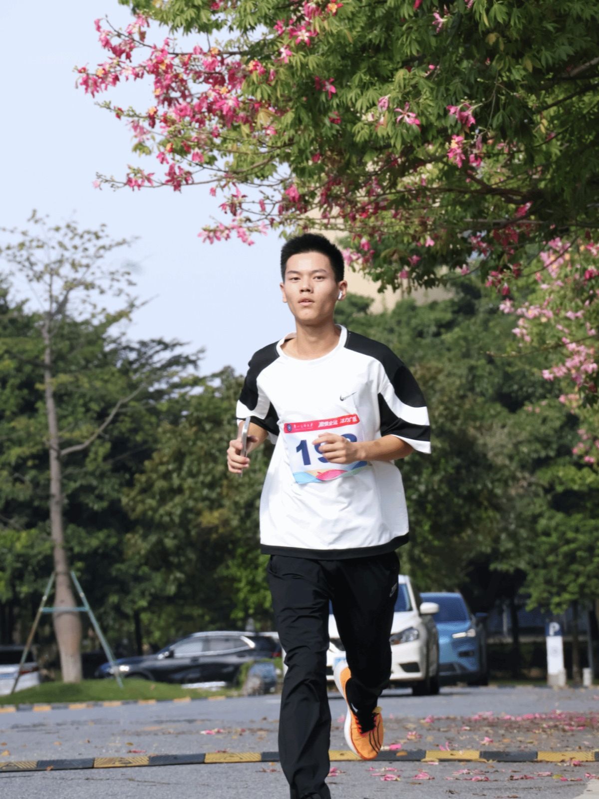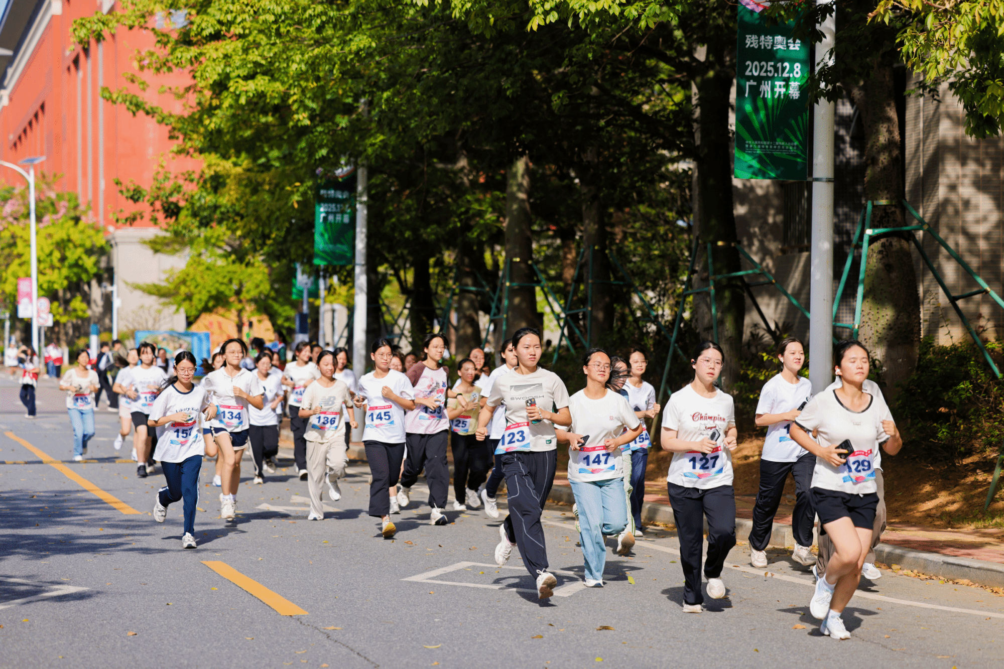 (参赛师生在校道迎风奔跑)