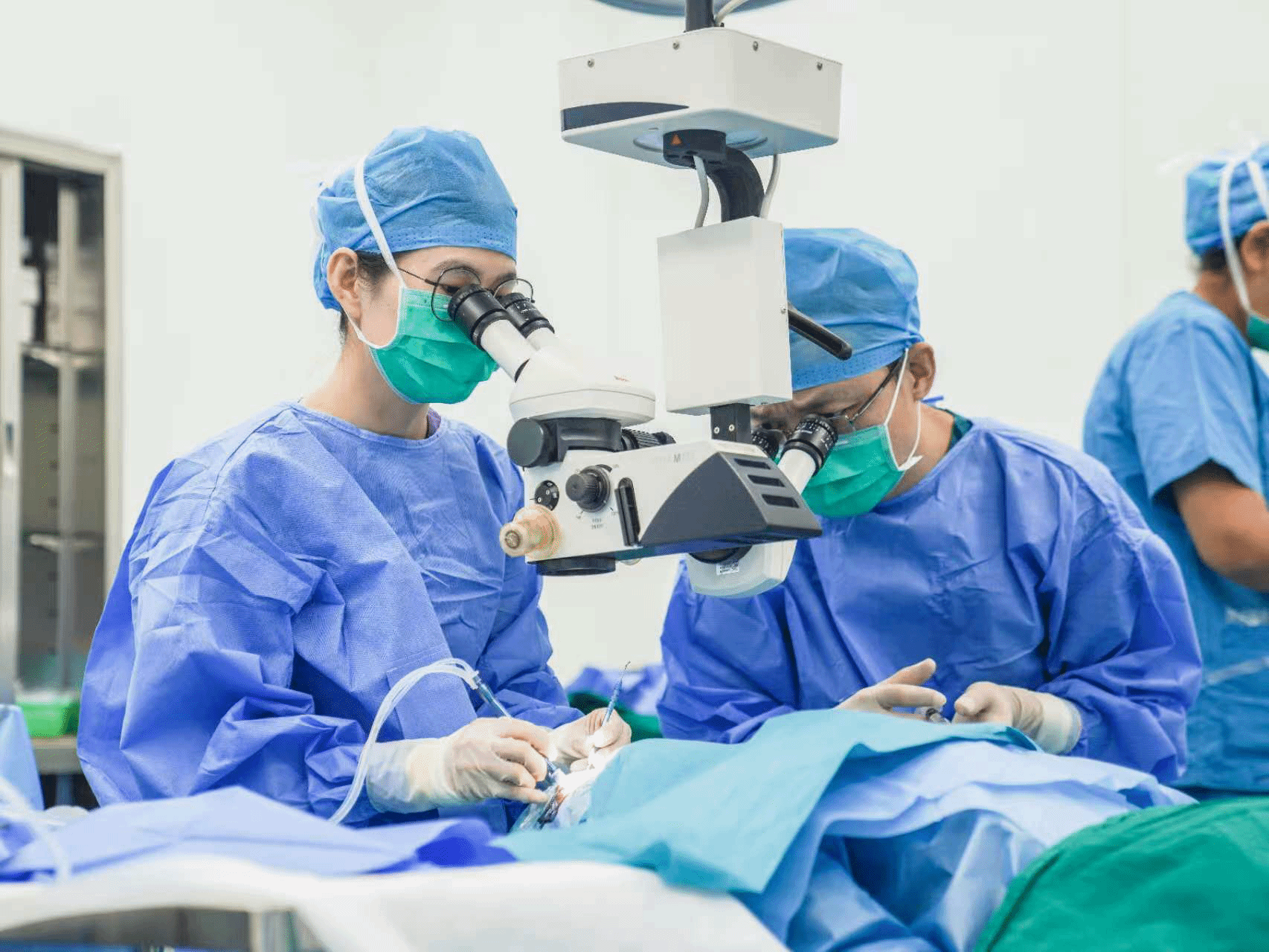 (带教西藏山南区人民医院藏族医生开展白内障手术,图右为王军明)