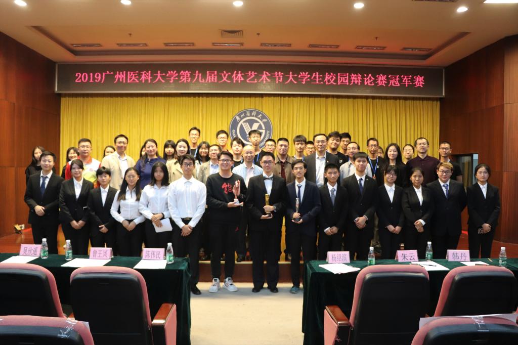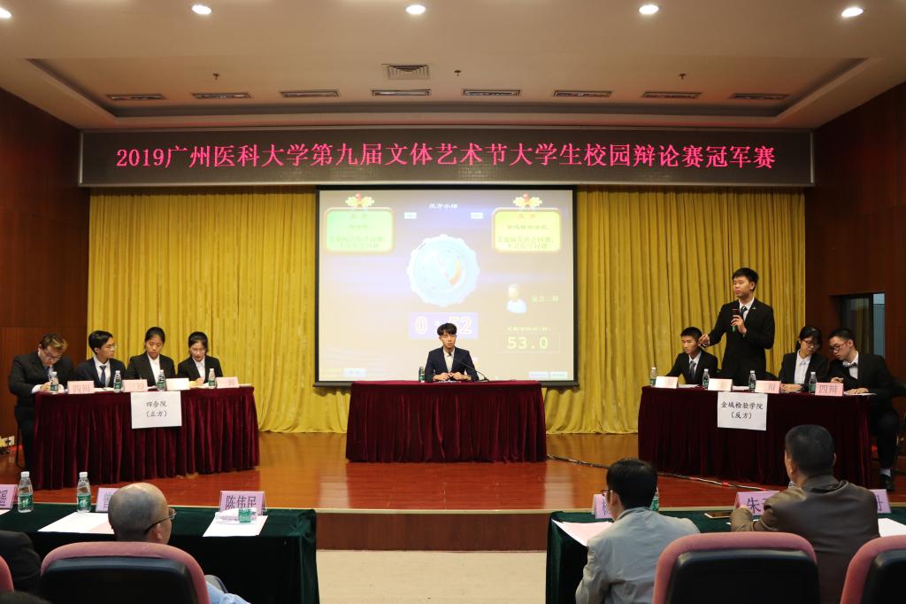 2019年11月28日晚,由学校团委主办、第一临床学院团委承办的第九届文体艺术节大学生校园辩论赛冠军赛在我校番禺校区图书馆报告厅拉开帷幕。评委由学校党委宣传部副部长杨绍滨老师,卫生管理学院朱云老师、韩丹老师担任,学校学生工作部(处)陈伟民部长,学校团委曾王兴书记、吴欣遥副书记、秦凯科长、王琳老师,金域检验学院学生科冯景贤科长,第六临床学院、儿科学院、精神卫生学院、市一学院(以下简称:四合院)学生办主任兼团委书记李树学老师,第一临床学院团委副书记吴星老师、各学院学生代表近500人参加活动。比赛由学校艺术团主持队成员、第一临床学院2018级吴宗徽同学主持。