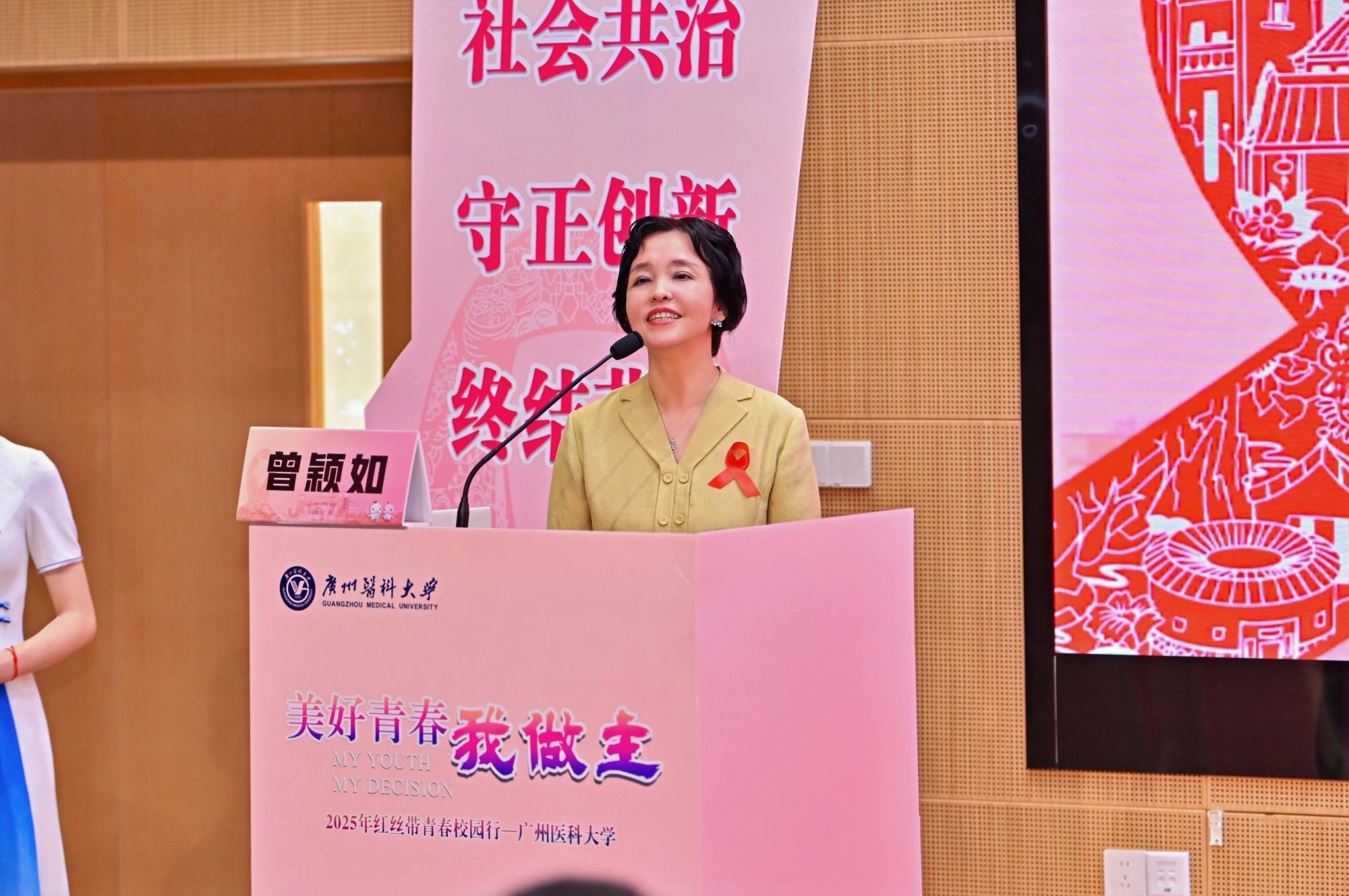 我校党委书记曾颖如在致辞中向来到现场的领导、嘉宾表示欢迎。她表示,作为一所以医学为优势和特色的国家“双一流”建设高校,广医高度重视青年学生健康成长,通过开设《大学生心理健康教育》课程、组建“青春红丝带”志愿宣讲团、开展防艾论坛剧场、组织青春健康讲师赛等多种形式,引导学生树立科学的健康观念。她亲切地寄语全体同学用专业和同理心去关爱他人、保护自己,将红丝带象征的爱心与责任不断传递下去,共同为实现终结艾滋病流行的目标贡献力量。