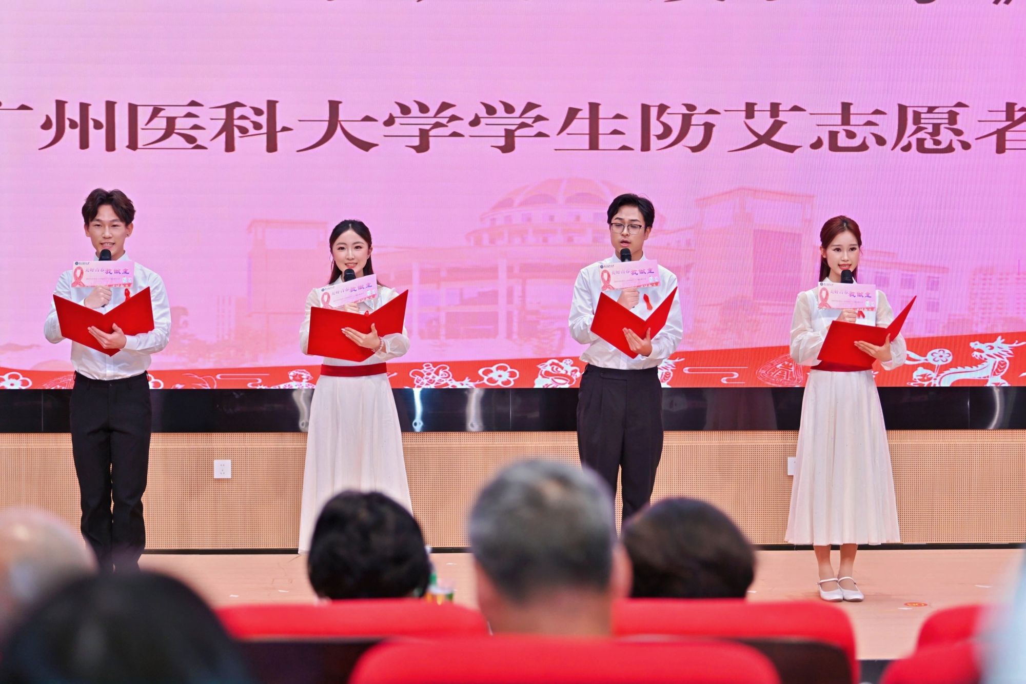 “让我们以知识为网、以理性为灯、以共情为桥,在每个年轻的心间播下防艾的种子。”广州医科大学青年大学生表演原创诗朗诵《红丝带,温暖相守》,用青春的声音传递防艾正能量。