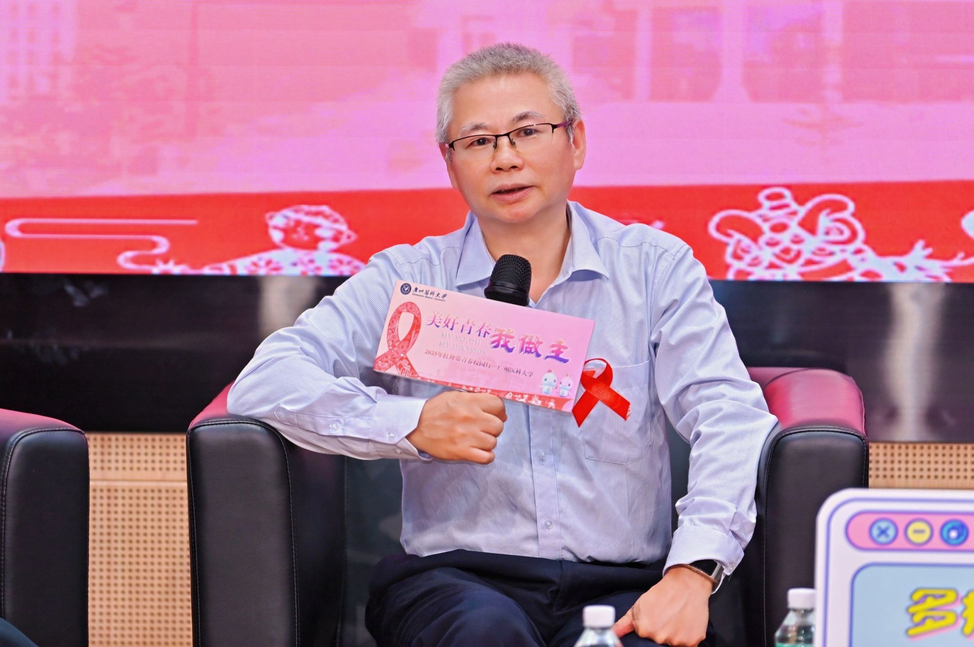 红丝带健康大使、中国煤矿文工团团长、一级演员靳东,中国性病艾滋病防治协会高级顾问王新伦,广东省疾病预防控制局副局长刘勇鹰,广东省教育厅体育卫生与艺术教育处副处长易寒飚,广东省疾病预防控制中心副主任李艳,中国性病艾滋病防治协会副会长、广东省性病艾滋病防治协会会长、我校原党委书记唐小平,广东省疾病预防控制中心传染病预防控制领域首席科学家林鹏,以及我校党委书记曾颖如,党委常委、副校长曾锦标,500余名师生代表参加活动。同时,该活动通过线上线下结合方式,吸引了广东省内十余所高校的青年大学生云端相聚。